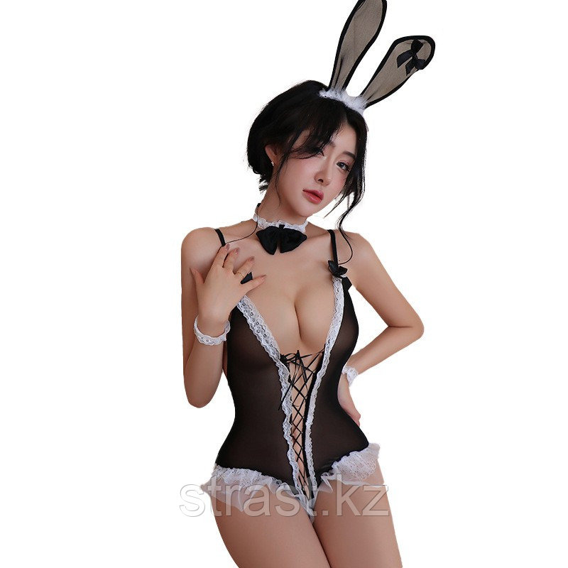 В комплект входит боди со шнуровкой и хвостиком, ободок с ушками, чокер-бабочка, манжеты, чулки в сеточку.